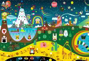 The work of Mary Winkler (aka Acrylicana) is vivid and whimsical. It's often child-like in theme, depicting sweets, fanciful creatures and rainbows as well as exploring the world of fashion and garments in illustrated form. Done in a variety of media, including digital, acrylic, watercolour and ink, Mary's work is pop art, graphic and, for lack of a better word, sparkly. Her work is painted on canvas, a variety of papers or printed by way of giclee ink jet or silk screen (usually onto fabric for pouches/bags). Mary studied Illustration at College for Creative Studies in Detroit, Michigan.